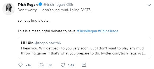Trish Regan也在推特上回复了刘欣,表示:“不要担心ーー我不扔泥巴,我只看事实。 所以,让我们找一个日期。 这是一场有意义的辩论。”