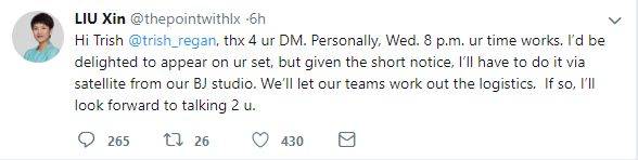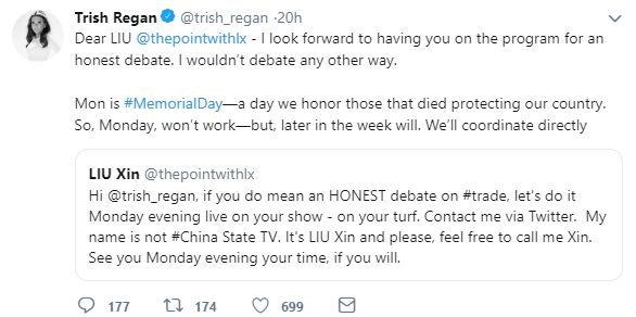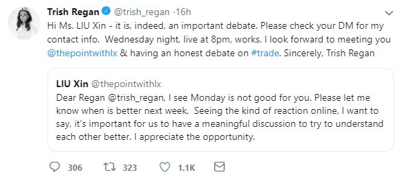 Trish Regan在3小时后回复刘欣,表示自己非常愿意在节目中和刘欣进行辩论,但周一是美国的节假日,但是希望能够在本周内安排这场辩论。