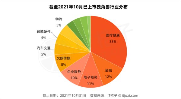 61 家成为独角兽后登陆二级市场的企业分布在医疗健康、电子商务、金融、企业服务等 12 个不同的领域。其中医疗健康领域有 20 家,占比 33%。德琪医药(生物技术和制药)、启明医疗(医疗器械及硬件)等 14 家企业登陆港交所;在纳斯达克上市的有泛生子(生物技术和制药)、燃石医学(生物技术和制药)、新氧(医疗综合服务)、厦泰生物(医疗器械及硬件);同样是生物技术和制药公司的诺禾致源登陆了科创板;2019 年 1 月 28 日,康龙化成在创业板上市交易,10 个月后,康龙化成又成功在港交所上市,其也成为继药明康德之后,又一家 A+H 上市的 CRO 企业。
