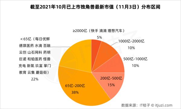 上市只是另一种开始。据统计,独角兽上市企业市值在千亿到 2000 亿之间及 500 亿到千亿之间的均为 6 家,各自占比 10%,200 亿到 500 亿的有 9 家,占比 15%。23 家市值在 65 亿-200 亿之间,占比 38%,为独角兽上市企业市值集中区间。