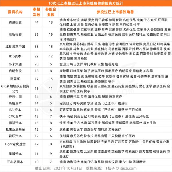 据 IT 桔子统计,61 家已 IPO 的独角兽企业曾在一级市场共有 1550 家不同的资方站台,其中连续 2 次参与独角兽上市企业的资方就有 270+,连续 10 次参投的合计 18 家,腾讯投资共 44 次参投,是 18 家独角兽上市企业的资方;高瓴投资参投 35 次,但参投企业高达 19 个,为独角兽上市企业最多的投资方;红杉资本中国在 18 家独角兽上市企业中投资 33 次,IDG 资本参投 12 家,出手 22 次。