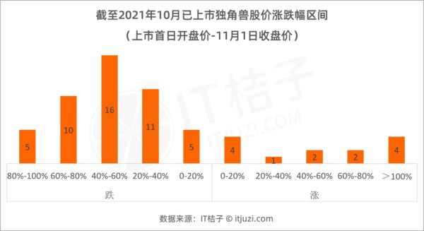 据统计,已上市独角兽企业中,13 家在上市首日至 11 月 1 日收盘,股价实现上涨。大牛股康龙化成(生物技术和制药企业)自 2019 年上市以来,在 A 股累计涨幅超 19 倍;在港股市场,其股价自上市以来累计涨幅超 262.5%;2020 年 7 月理想汽车登陆美股,发行价 15.49 美元,318 个交易日后即 11 月 1 日收盘价为 32.34 美元,涨幅 108.8%,在美上市一年后,今年 8 月,理想汽车正式登陆港交所,发行价 118 港元,至 11 月 1 日收盘价 125.9%,也实现 6.7% 的上涨。