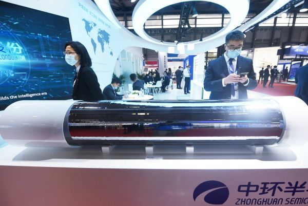 2021年3月17日,参观者在观看中环半导体12英寸(300mm)的单晶硅棒。