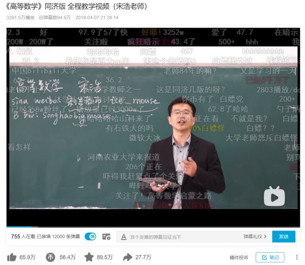 宋浩想得很简单,在B站做UP主,是进一步实现传播知识的使命。“每天有30万次播放,如果一个人看两个视频,那就是每天15万人学习我的数学课,而大学老师上课,一周最多普及到1000个学生,这个数据对比非常直观,我对知识传播的贡献,远远超过线下,影响力是很大的。”