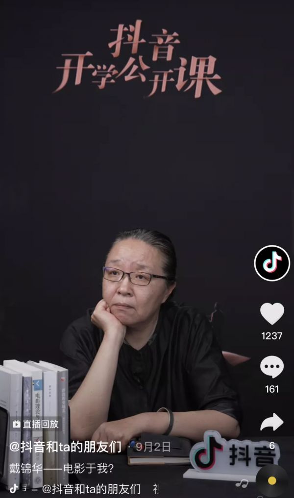 6月,北京大学电影与文化研究中心主任、中文系教授戴锦华在B站上传了首条视频,如今粉丝量超过36万,视频播放量达965万。9月,她作为抖音科学公开课系列的头位主讲老师,三个小时直播“电影于我”的主题分享。