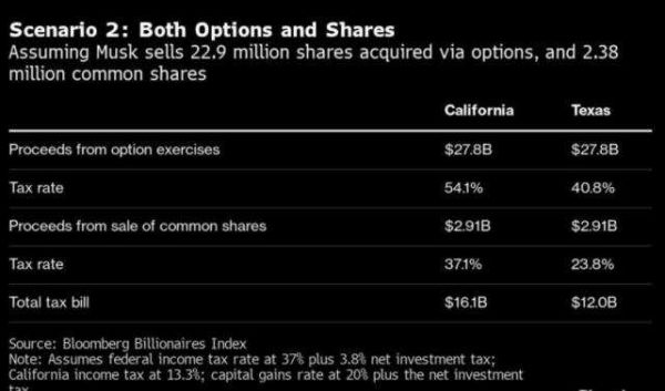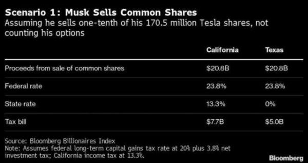 假设马斯克只出售他所持10%普通股,可以获得的收益为208亿美元,但他需要缴纳20%联邦资本利得税和3.8%的净投资税,还需要向加州缴纳13.3%的个人所得税,纳税总额约为77亿美元。但如果在没有个人所得税的得州完税,他可以省下27亿美元。
