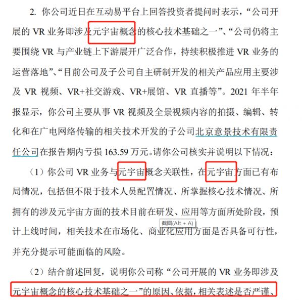 11月7日晚,佳创视讯多个涉及元宇宙的问题被关注,如此前公司在互动平台表示“公司开展的VR业务即涉及元宇宙概念的核心技术基础之一”,深交所要求说明上述论断的原因、依据,及相关表述是否严谨、合理,是否存在主动迎合市场热点炒作公司股价的情形。
