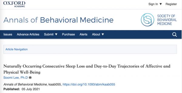 [5] Soomi Lee. Naturally Occurring Consecutive Sleep Loss and Day-to-Day Trajectories of Affective and Physical Well-Being. Annals of Behavioral Medicine, 2021; DOI: 10.1093/abm/kaab055