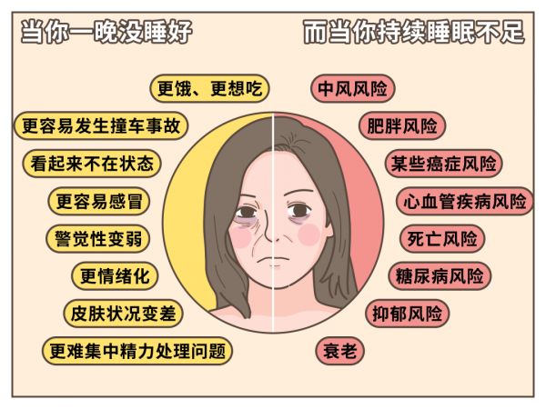睡眠不足,不仅仅会出现一些短期的身体症状,还会对免疫系统有损害,让人更容易生病,并且大量研究还发现糖尿病、心血管疾病、中风和抑郁症的风险大大升高。