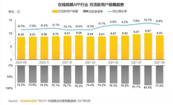 (在线视频APP流量月活用户在8.45亿至9.08亿,网民渗透率超过70%,剩下的用户实际在其他终端可覆盖)