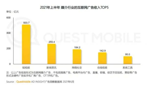 据QM数据显示,2021年上半年在线视频行业广告投放高达142.9亿元,这其中主要是以腾讯视频、爱奇艺、优酷等为主;落后于短视频上半年503.7亿投放,以及新闻资讯端255.4亿元。