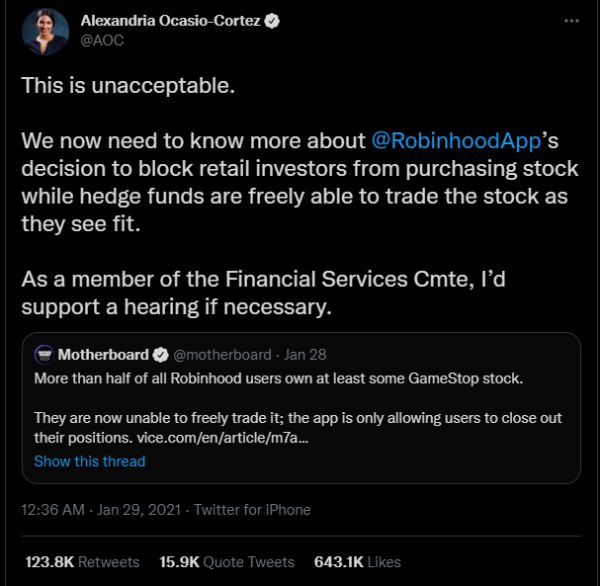 4)GameStop 轧空运动:前面提到在 GME 等“垃圾”股票价格暴涨之后,Robinhood 很快强行关闭了对这些股票的交易功能,遭到了用户的强烈反对和游行示威,甚至连美国国会都传召该公司 CEO Vlad Tenev 出席听证会解释其所作所为。 知名美国民主党进步派议员 Alexandria Ocasio-Cortez 谴责 Robinhood 的行为,“Robinhood 的决定让散户投资者无法购买股票,但与此同时对冲基金却能够毫无限制地进行交易。 ”