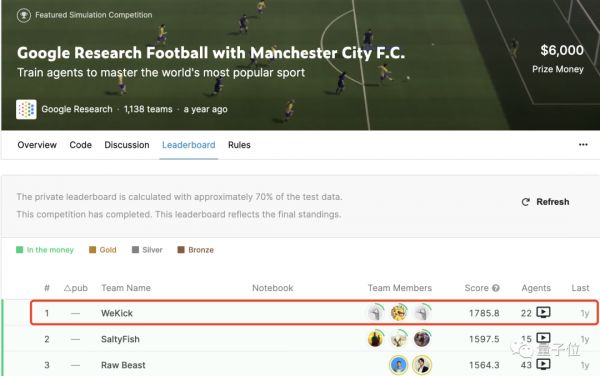他们先从Kaggle在2020年举办的GRF世界锦标赛中,观摩了最终夺得冠军的WeKick团队数万场的自我对弈数据,使用离线强化学习方法从中学习。