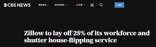 根据媒体报道,11月2日,Zillow发出声明,公司将放弃房屋翻售业务。声明中表示,公司的快速买卖房屋的算法+模式未能按计划发挥作用,造成巨额亏损。预计第三和第四季度的合并亏损将超过5.5亿美元。公司计划裁员2000人,约占全部员工总数的25%。声明发布后的一周内公司股价大跌近三分之一。