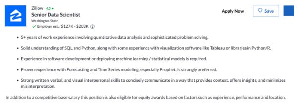 Zestimate的核心是预测,最关键的应该是数据科学家,我们来随便看一个Zillow公司数据分析师的招聘广告是什么样。