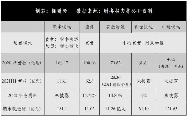 德邦的现金流及现金等价物规模在五家公司中相对较低,为11.02亿元,且目前其正发力转型快递业务,所以零担快运业务拿到的资源或许也较为有限。