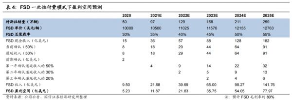 国信证券预测,特斯拉FSD的装机量以每年5%的增速增长,预计FSD收入将从 2020年的9.50亿美元快速增长至2025年的141.76 亿美元,复合年增长率达 72%。以净利率55%测算,到2025年FSD可以为特斯拉提供近78亿美元的盈利空间。