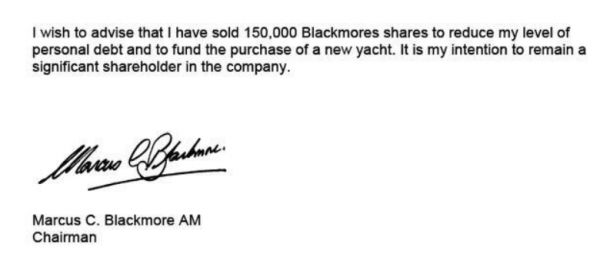 2015年3月13号,澳大利亚上市公司董事长Marcus Blackmore写了一份减持股份的声明,本来股东减持通常会写一些堂皇的理由,比如支持公司继续发展之类,但是“任性”的Blackmore董事长写道:“我卖掉15万股票是为了还自己的债,还有需要买一艘游艇改善生活。”