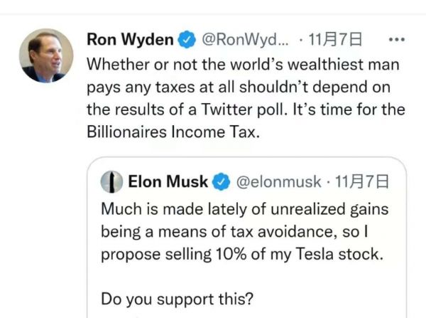Wyden11月7日在推特转发了马斯克的投票,并表示,是否对世界首富征税不应取决于推特民调,是时候征收亿万富翁税了。