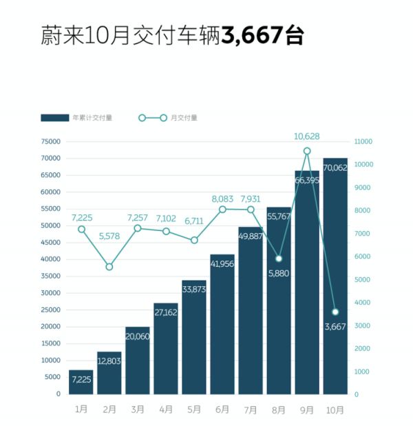 第三季度交付量,蔚来落后于小鹏、理想,紧接着在10月,蔚来交付量只有3667辆。