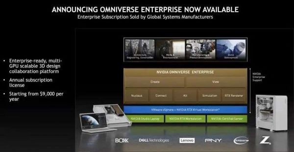 一段时间以来,黄仁勋一直在强调的一个领域是NVIDIA Omniverse,这是一个多媒体3D协作平台,使公司能够使用正在开发的产品或正在模拟的问题的物理精确的“数字孪生”在元宇宙中进行协作。它可以是一辆汽车、一座工厂、一个地球或者一部新的好莱坞大片。黄仁勋宣布,Omniverse Enterprise之前还处于测试阶段,现在可以从全球系统供应商那里获得,起价为每年9K美元。