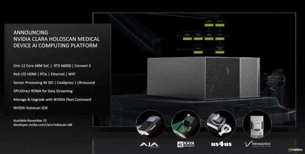 针对医疗市场,英伟达推出了一款全新的Clara Holoscan平台,采用Arm / RTX A6000 GPU和ConectX DPU。英伟达还宣布了其他几项医疗保健业务。
