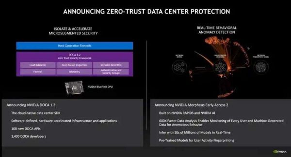 说到DPU,英伟达宣布了另一个平台(Morpheus),该平台使用智能网络接口和软件,利用BlueField创建零信任数据中心保护。在现代数据中心中,每个服务器都可以被视为一个威胁。因此,防火墙保护的概念必须从外围延展到每一台服务器。