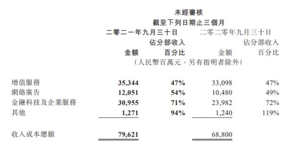 腾讯2021年Q3分业务收入