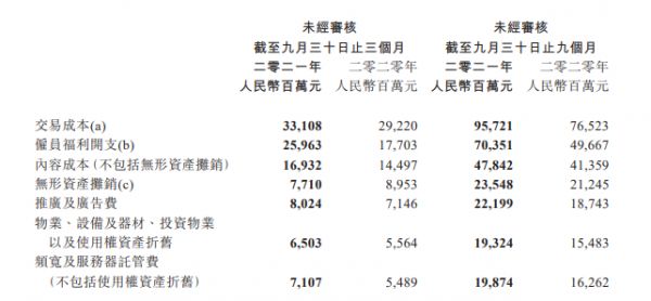腾讯2021第三季度收入成本