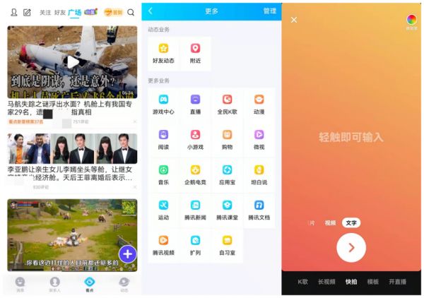 对比抖音和QQ两家APP的功能页面,不难看出,在聚合今日头条、西瓜视频等业务板块之前,二者之间就已经存在着不少的功能重合。