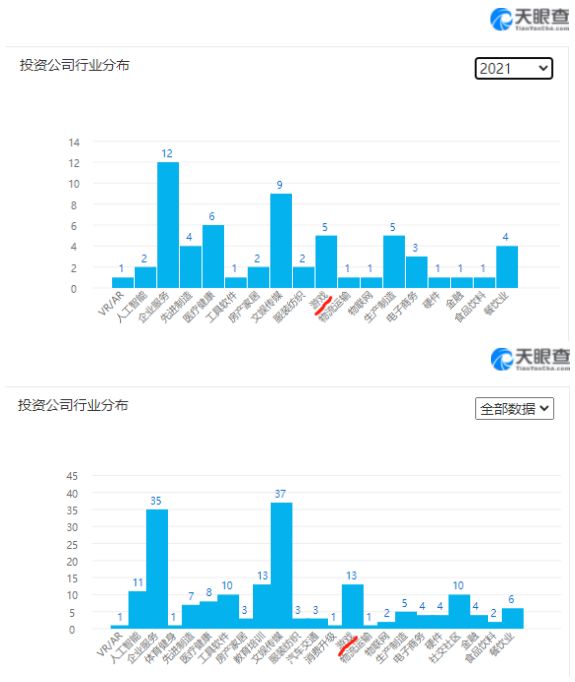 在天眼查的投资公司行业分布统计数据中,可以看到在还未结束的2021年,字节跳动就投资了5家游戏公司,几乎占据全部13家游戏公司投资的一半。