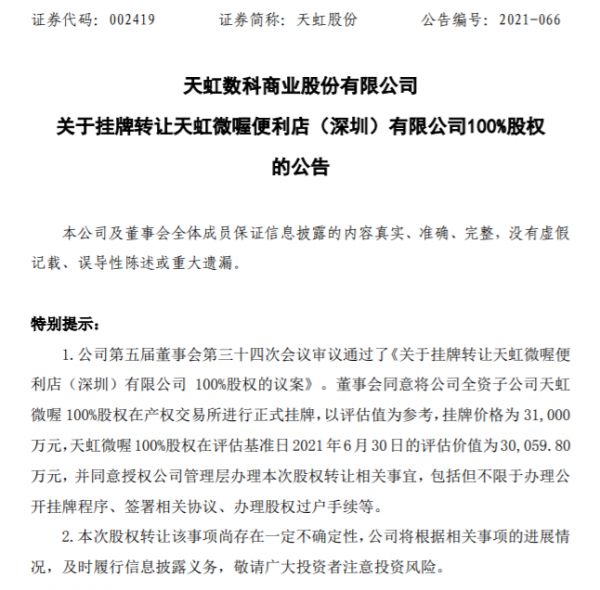 据悉,本次股权转让事项已完成产权交易所预挂牌。根据国有产权交易规定,本次转让需在产权交易所进行正式挂牌。2021年11月8日,公司第五届董事会第三十四次会议审议通过了《关于挂牌转让天虹微喔便利店(深圳)有限公司100%股权的议案》。