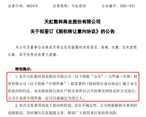 天虹股份也表示,本次股权转让将在产权交易所以公开挂牌及网络竞价方式进行,公司不承诺中国罗森一定可以被确定为受让人。