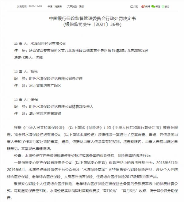时任水滴保险总经理杨光,对上述行为负有直接管理责任。时任水滴保险精算部负责人张强,对上述行为负有直接责任。