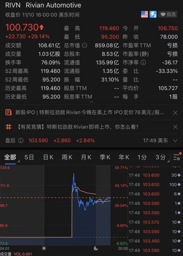 Rivian美国IPO首日高开约35%,报106.75美元。盘中一度跳涨53%,随后回吐部分涨幅,今日收于100.73美元,涨幅29.14%。最新市值为859.08亿美元。