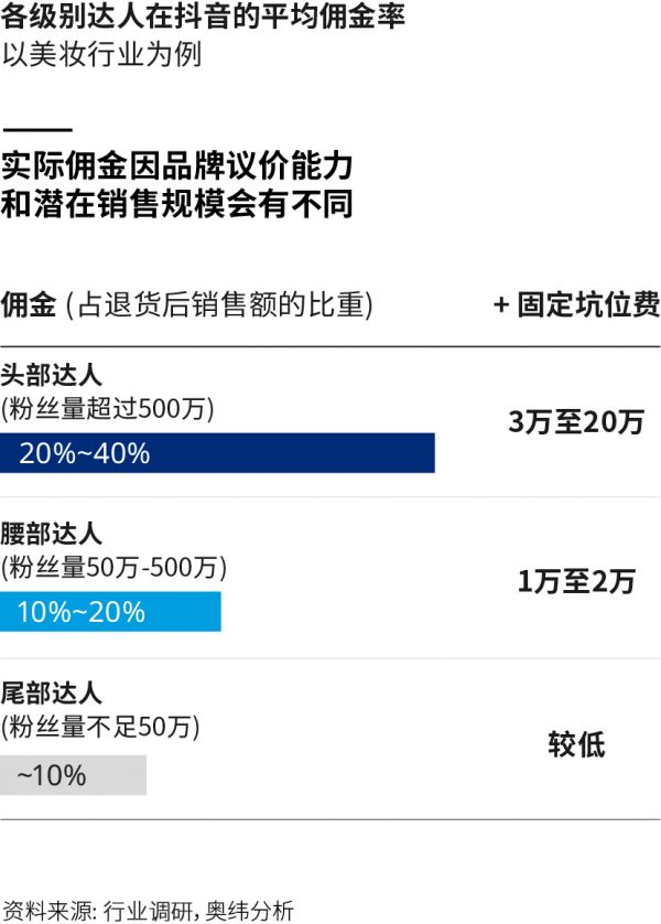 以奥纬咨询来看,以奥纬咨询来看,在美妆领域,头部达人(粉丝高于500百万)的抽佣已经达到了20%-40%,这还不算他们的3万甚至达到20万人民币的坑位费,中腰部达人的佣金比例在10%至20%,坑位费1至2万左右,但大量刚起步的KOL议价空间十分有限,抽佣也很难高于十个点。