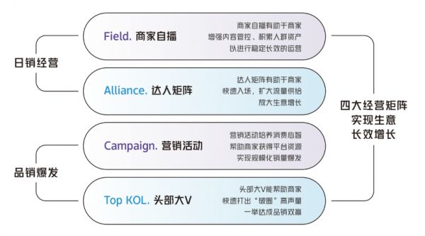 根据抖音电商此前发布自身的FACT矩阵模型,商家的四大经营阵地是,Field,商家自播的阵地经营;Alliance,海量达人的矩阵经营;Campaign,营销活动的组合爆发;Top Kol,头部大V的品效双赢。这就把品牌能走的路子,清晰地摆出来了。