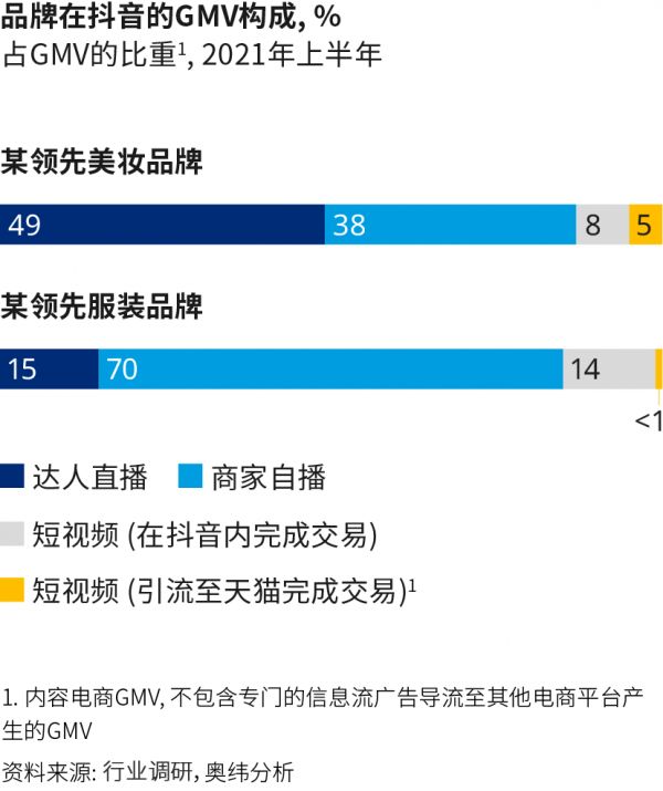 奥纬咨询统计至2021上半年的数据,店播和短视频已经开始发挥更大的作用。在「抖化」明显的美妆和服装行业,由达人直播带货贡献的销售额均有所下降,对于某领先服装品牌而言,已压缩之15%,显著低于抖音全平台约50%的水平;与之形成鲜明对应的是,店播渠道贡献该品牌销售额的70%左右。短视频则贡献剩余15%。