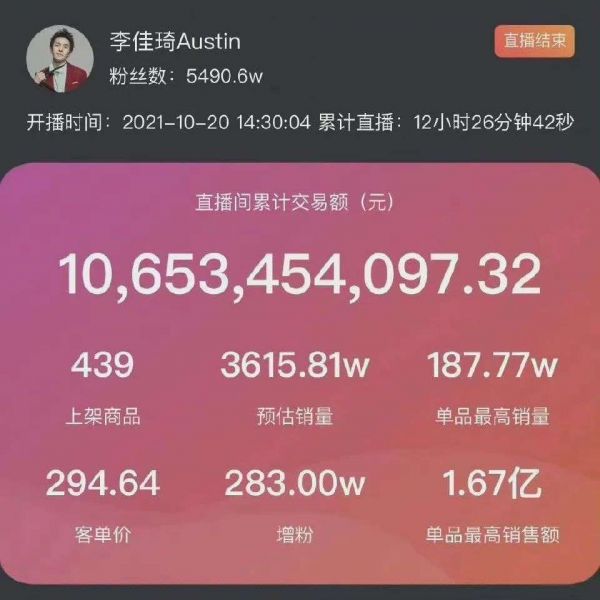根据媒体发布的数据显示,李佳琦当天的直播超过12个小时,观看人数达到2.49亿人。根据淘宝主播销售榜显示,李佳琦当晚销售额达106.53亿元。无论是从观看人数还是销售额来看,李佳琦都交出了一份令人满意的答卷。