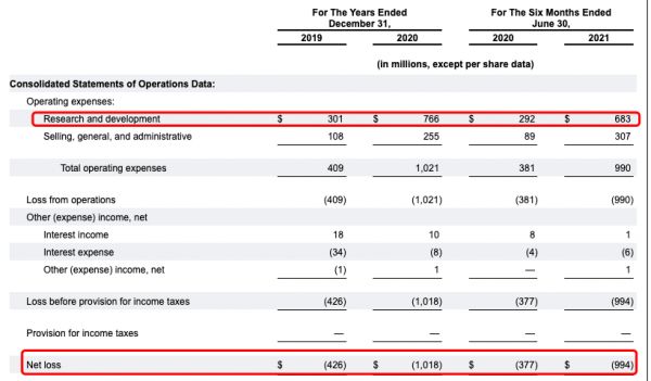 可以看到,目前Rivian的亏损情况不但没有随着时间的推进而减少,甚至还有增多的趋势。而这主要也跟研发的投入有关,2019年Rivian的研发投入为3.01亿美元(约合人民币19.2亿元),2020年的研发投入则为7.66亿美元(约合人民币49亿元),而仅今年上半年,其研发投入就达到了6.83亿美元(约合人民币43.7亿元)。