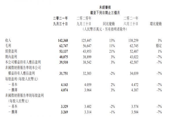 财报显示,第三季度,腾讯营业收入为1424亿元,同比增长13%;非国际财务报告准则下,腾讯的权益持有人应占盈利为317.5亿,同比下滑2%。