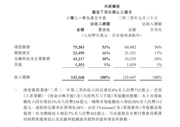 同时,腾讯更新了增值服务收入的财报披露。从本季度开始,腾讯将本土市场游戏和国际市场游戏的收入作为增值服务业务下的新增子分部披露。