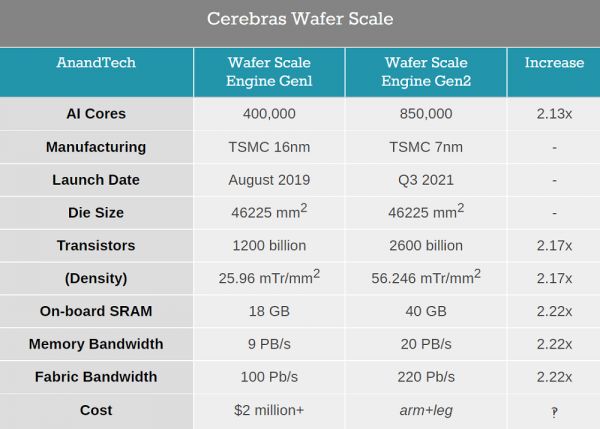 ▲Cerebras两代处理器参数对比(来源:AnandTech)