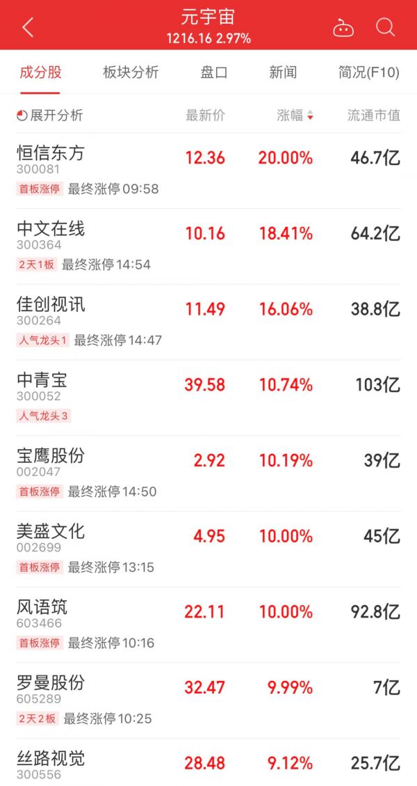 据同花顺app,11月11日,元宇宙概念板块大涨2.97%,恒信东方、中文在线、佳创视讯、宝鹰股份、美盛文化、风语筑、罗曼股份、新国脉等多只股票涨停。其余股票也普遍上涨。
