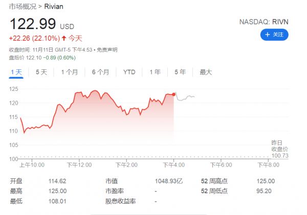 周四,Rivian 的股价在公开市场首次亮相一天后继续攀升,收报122.99美元,涨幅22.1%。
