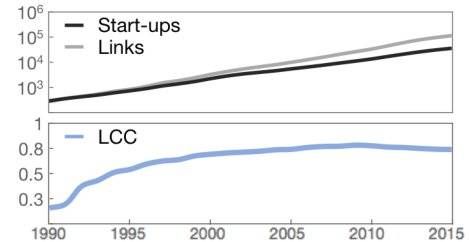 创业公司(黑色)和连边(灰色)的增长数量;节点被包含进 LCC 的比例(蓝色)。
