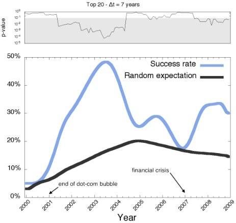 从上图我们可以看到从 2000 年至 2009 的该模型对 Top 20 的预测成功率约为 30 %。并且我们会发现,一个随机选择的模型的预测能力和传统的投资机构的投资成功率几乎是接近的。