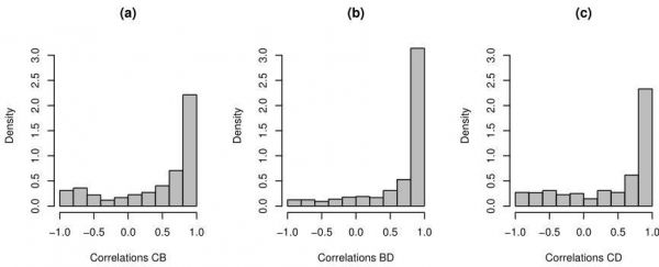 中心性度量指标的相关性,从左到右表示了亲近中心性-中介中心性(CB, 图a)、中介中心性-度数中心性(BD,图b)、亲近中心性-度数中心性(CD,图c)的皮尔森相关系数。
