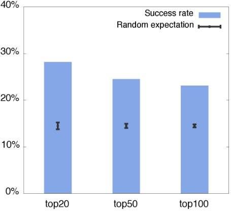 预测排名(蓝色实线)的成功率和随机排位(黑色实线)的比对图像。其中上部的小图表示的是显著性指标 p 值。灰色阴影部分表示的是结果显著(p值<0.05)的部分。