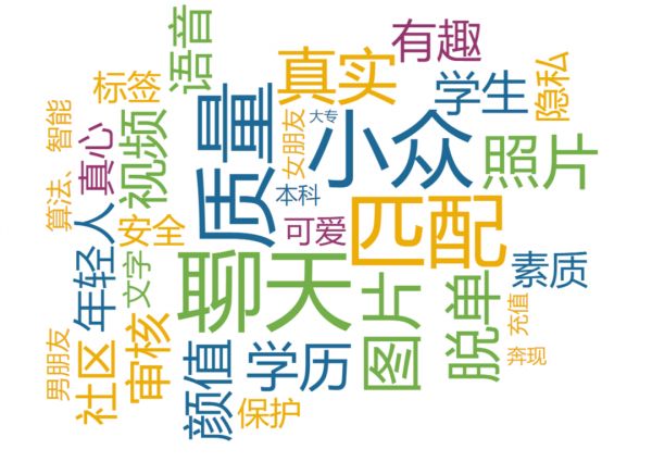 有研究在分析大学生恋爱心理时指出,现在大学生恋爱总体健康向上又轻率,追求自由有时却过于开放,处理爱情问题趋于理性却又轻率。[4]而根据本文作者 对陌陌、可话、Nico、falo、麦池、青藤之恋、积目、微光等众多陌生 人社交软件的故事式广告文本进行分析,从出现频率靠前的关键词中发现,这一系列的软件都有着诸多相似的特色标签。 多数产品的设计者的确是有意调研受众的心理与 特点,试图打造能够受更多人欢迎的软件。